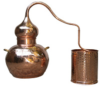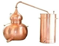 Медь, из которой сделан аламбик, обладает уникальным комплексом достоинств: ручная ковкая, не подвержена коррозии, обеспечивает равномерный прогрев содержимого куба, служит прекрасным катализатором сложных химических реакций в вине, не изменяя при этом его вкуса и ароматов, Для того чтобы содержащиеся в вине взвешенные частицы не собирались в углах, аламбику приданы закругленные формы. Это облегчает и его чистку. Пары спирта, который начинает кипеть раньше воды, накапливаются в шлеме, затем, под действием повышающегося давления, выталкиваются в отводную трубу («лебединую шею») и попадают в змеевик, находящийся в наполненной холодной водой емкости.